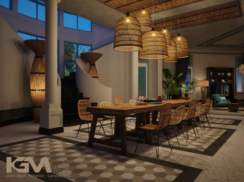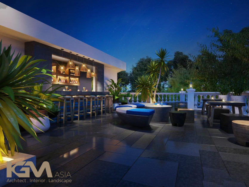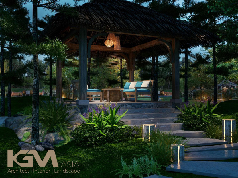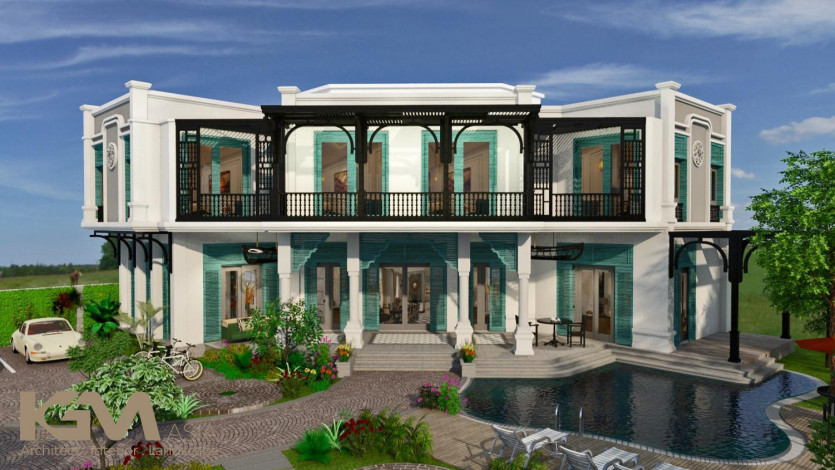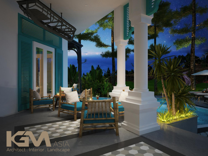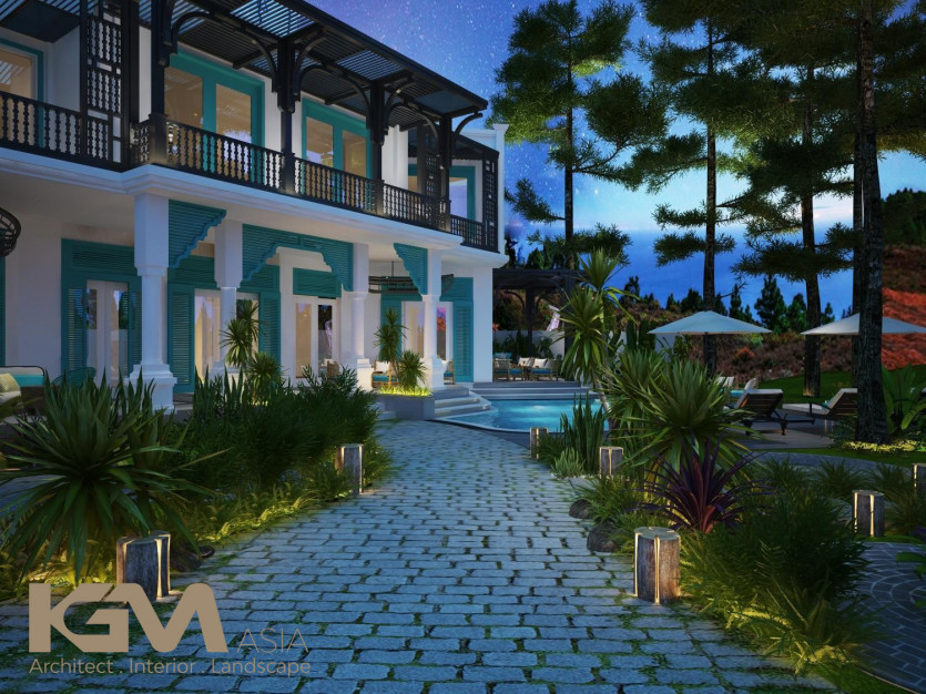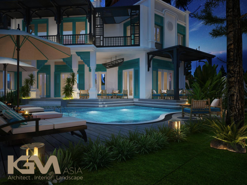 Nhìn tổng quan từ bên ngoài, căn villa nổi bật nhờ hệ thống cửa sổ và vách ngăn CNC, mái hiên pergola gỗ kiểu Đông phương như tô điểm thêm cho sự lãng mạn và cuốn hút của không gian nơi đây. Với diện tích sân vườn lớn, tại mọi không gian của công trình, KGM đều hướng mở tới các view xanh của thiên nhiên. Đường nét khuôn viên và bể bơi uốn lượn theo những đường cong mang đến “xúc cảm sáng tạo” có chủ đích của kiến trúc sư.