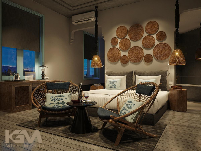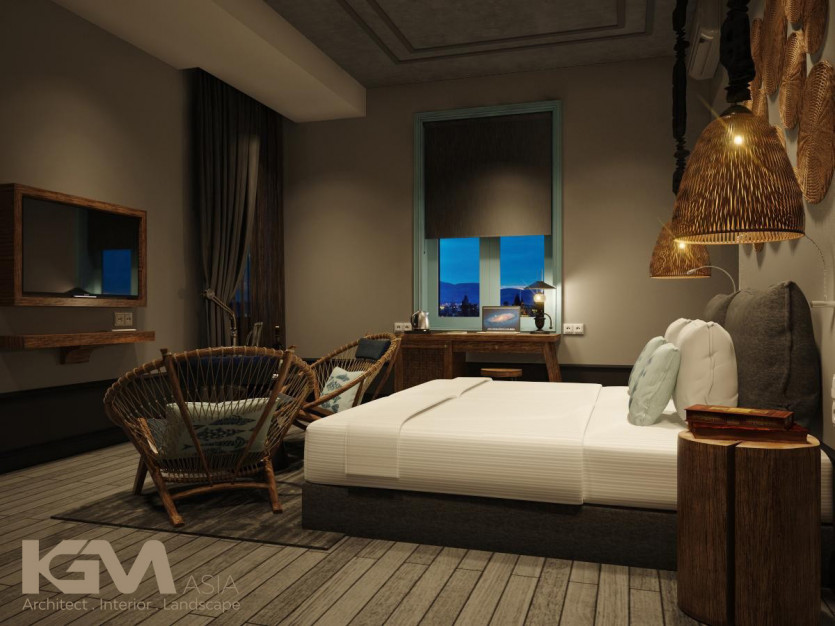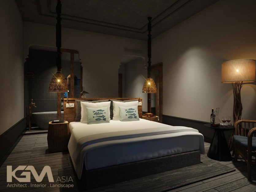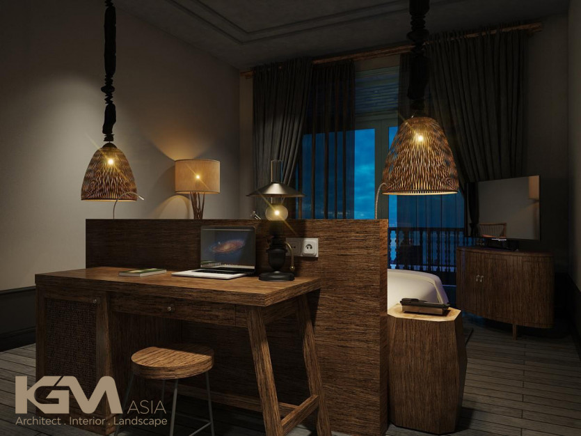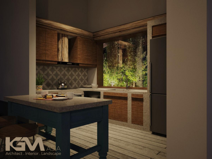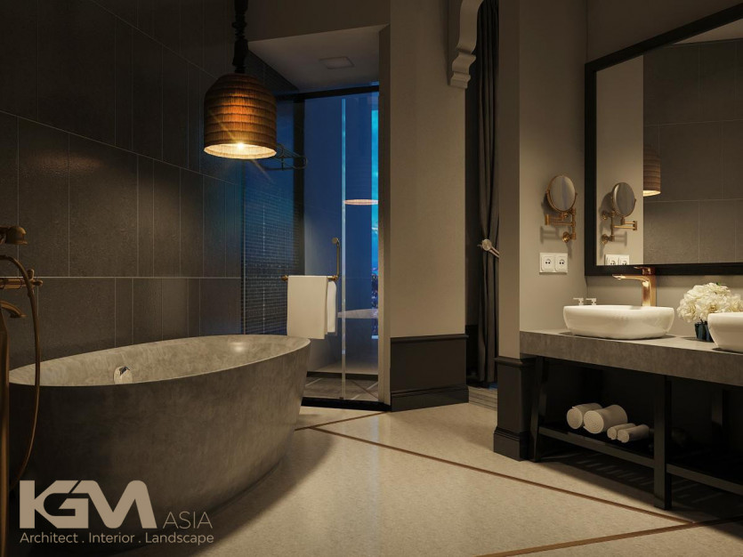 Nhìn tổng quan từ bên ngoài, căn villa nổi bật nhờ hệ thống cửa sổ và vách ngăn CNC, mái hiên pergola gỗ kiểu Đông phương như tô điểm thêm cho sự lãng mạn và cuốn hút của không gian nơi đây. Với diện tích sân vườn lớn, tại mọi không gian của công trình, KGM đều hướng mở tới các view xanh của thiên nhiên. Đường nét khuôn viên và bể bơi uốn lượn theo những đường cong mang đến “xúc cảm sáng tạo” có chủ đích của kiến trúc sư.